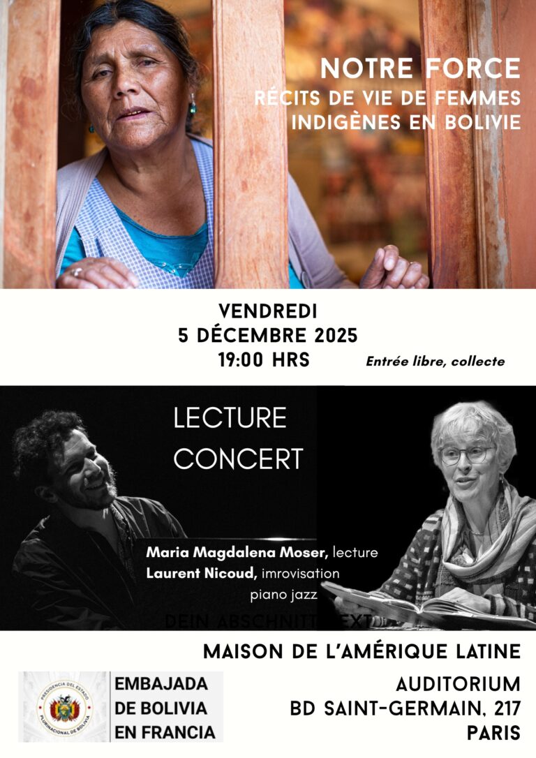 Lecture Concert à là Librairie Tschann Dimanche, 25 mai 202511.00 heures125 Bd du Montparnasse, ParisEntrée libre, collecte Maria Magdalena Moser, lectureLaurent Nicoud, improvisation Piano Jazz Notre force nous porte vers l’avant. Récits de vie de femmes indigènes en Bolivie Maria Magdalena…